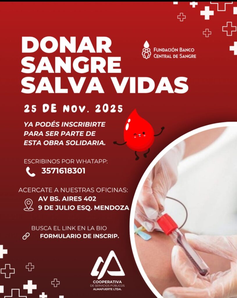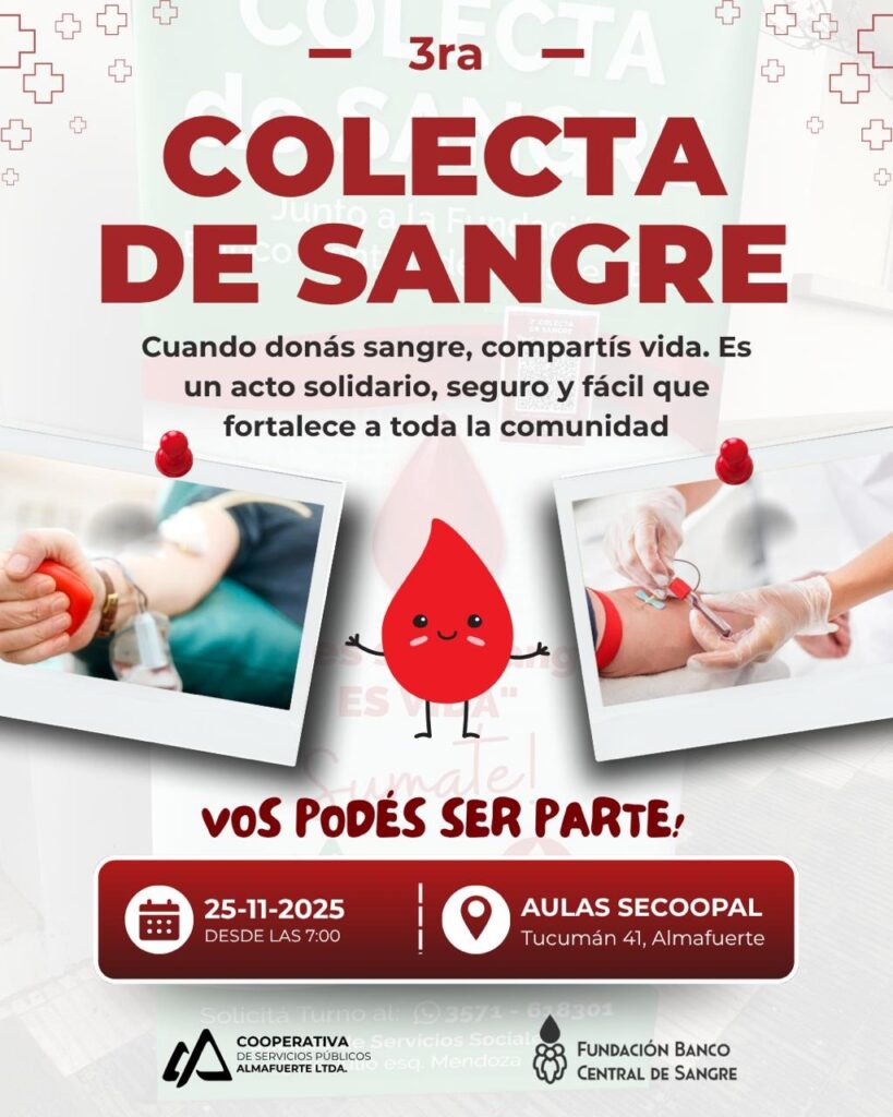La ciudad de Almafuerte se prepara para vivir una nueva edición de la Colecta de Sangre “Almafuerte dona vida”, una iniciativa que busca fortalecer la red solidaria de donantes y promover la importancia de este gesto que salva vidas.