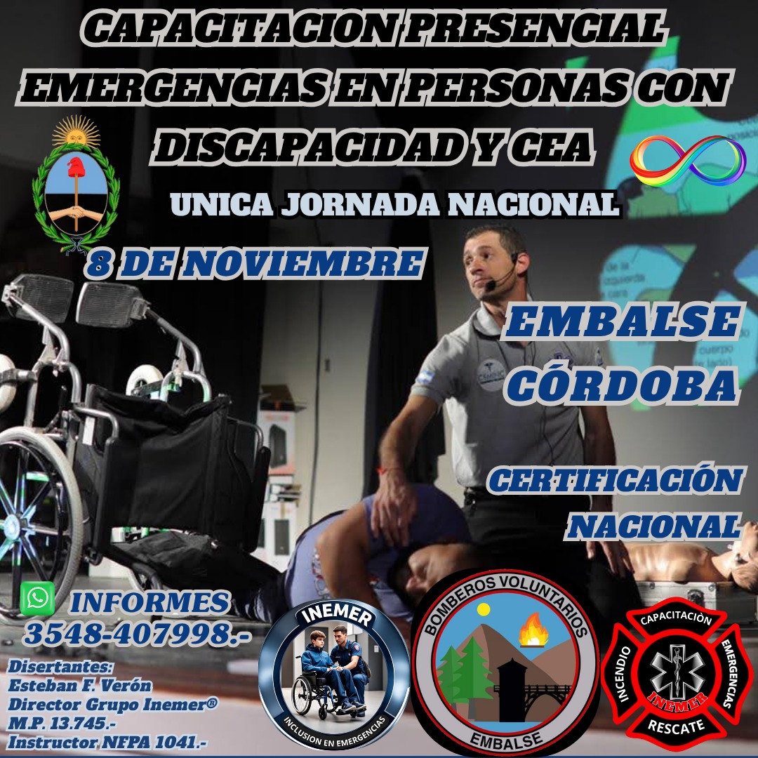 En otro tramo de la entrevista, Corchero anunció que el próximo 8 de noviembre se llevará a cabo en Embalse la única capacitación presencial a nivel nacional sobre emergencias en personas con discapacidad, organizada por Bomberos Voluntarios de Embalse junto al grupo IMER, dirigido por el instructor Esteban Verón, profesional certificado por la NFPA (National Fire Protection Association).