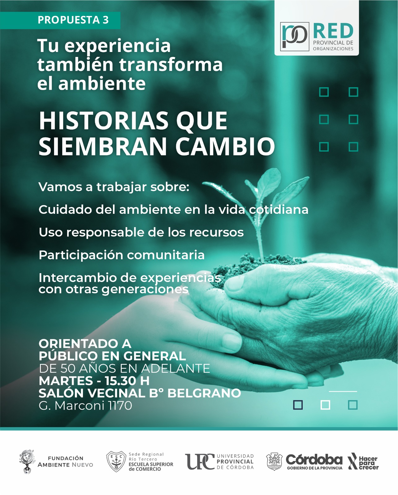 - Historias que Siembran Cambio: Un taller pensado exclusivamente para los adultos mayores. Esta actividad se desarrollará los martes a las 15:30 hs. en el Salón de Barrio Belgrano.