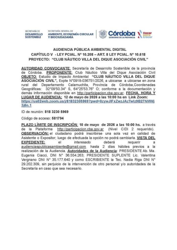 En el marco de la Ley Provincial N° 10.208 de Política Ambiental, se ha formalizado la convocatoria para la Audiencia Pública Ambiental Digital correspondiente al proyecto denominado «Club Náutico Villa del Dique Asociación Civil». Este proceso es un requisito indispensable para avanzar en la evaluación del Estudio de Impacto Ambiental (Expte N°0918-036751/2026) de la iniciativa, que se prevé emplazar en la zona rural del departamento Calamuchita.