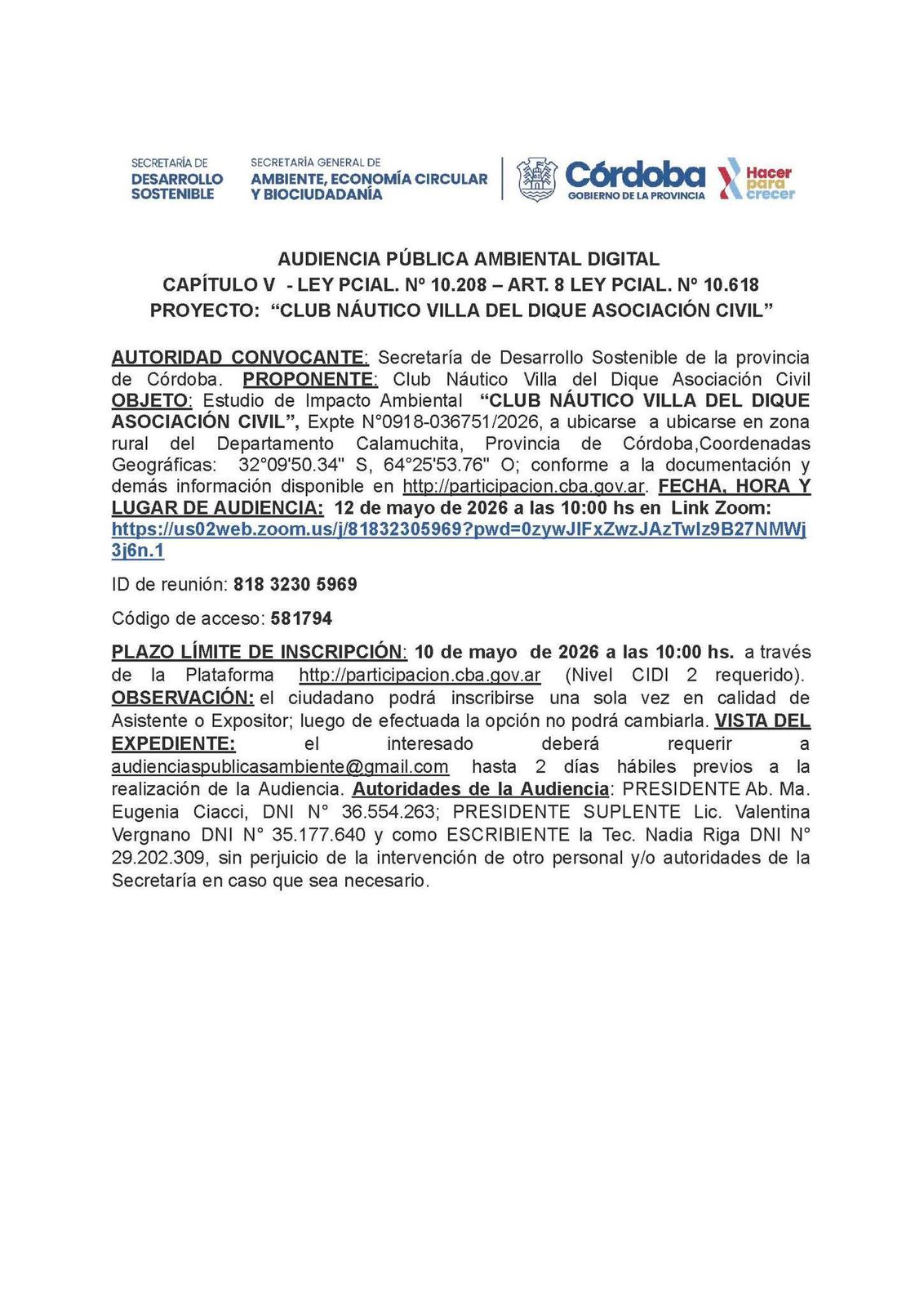 Dada la normativa vigente de modernización del Estado, la audiencia se llevará a cabo de manera virtual a través de la plataforma Zoom el próximo 12 de mayo de 2026 a las 10:00 hs. Los interesados en participar deberán tener en cuenta los siguientes datos de acceso: el ID de reunión es 818 3230 5969 y el código de acceso es 581794.