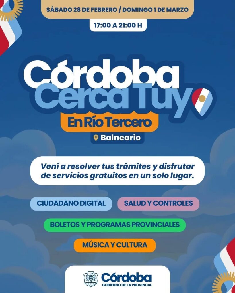 El Gobierno provincial llevará adelante una nueva edición del programa Córdoba Cerca Tuyo en la ciudad de Río Tercero, con el objetivo de acercar trámites, servicios y actividades a vecinos de toda la región.