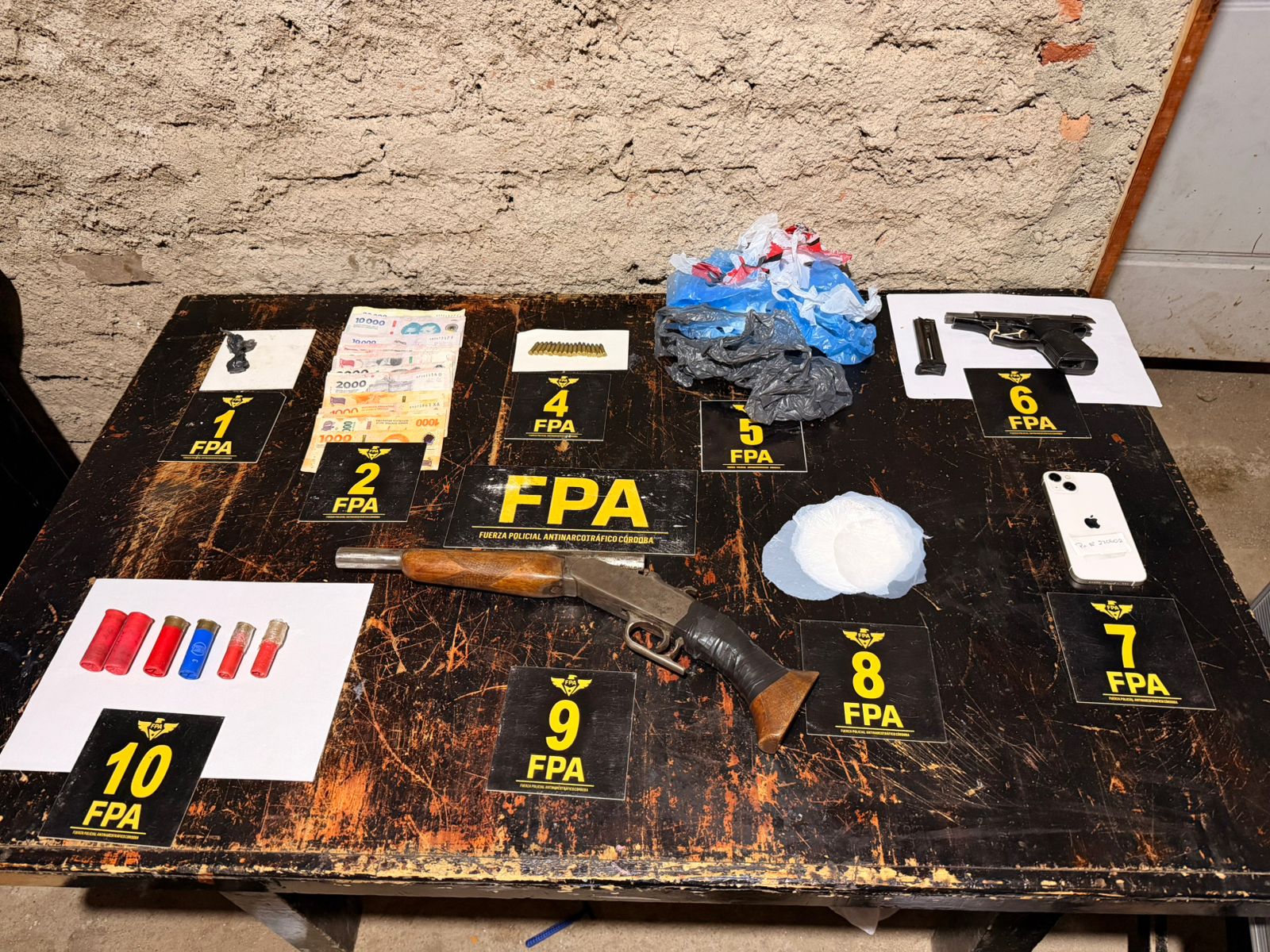 Durante los registros domiciliarios se incautaron varias dosis de cocaína y marihuana, $517.950 en efectivo, dos armas de fuego (una escopeta y una pistola), 124 cartuchos de distintos calibres y elementos vinculados al fraccionamiento de sustancias ilícitas.