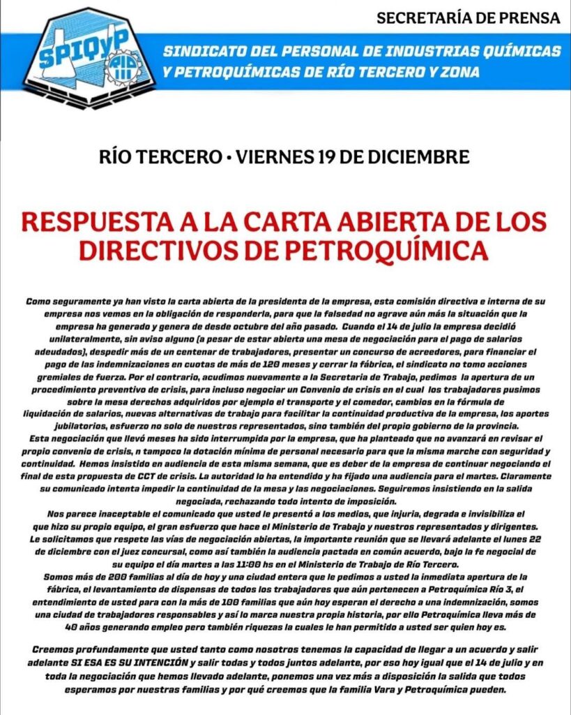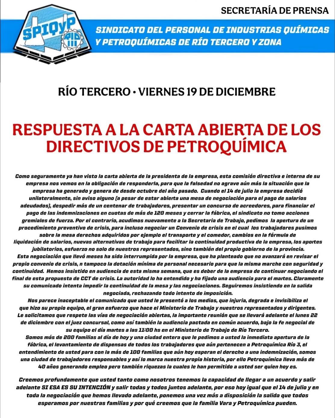 El Sindicato del Personal de Industrias Químicas y Petroquímicas de Río Tercero y Zona (SPIQyP) difundió este viernes 19 de diciembre un comunicado oficial en respuesta a la carta abierta publicada días atrás por los directivos de Petroquímica Río Tercero, firmada por su presidenta y accionista mayoritaria, Verónica Vara.