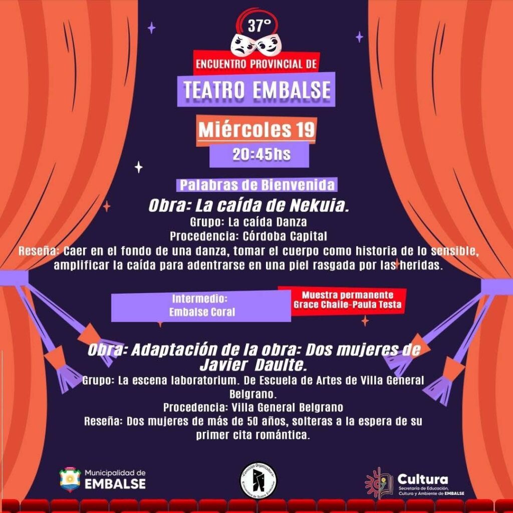 Desde este miércoles 19 y hasta el 22 de noviembre, Embalse vivirá una nueva edición del Encuentro de Teatro, una propuesta que cumple 37 años y que se ha convertido en uno de los hitos culturales más importantes de la región. Organizado por la Comisión del Encuentro de Teatro de Embalse, el evento tendrá lugar en el Centro Cultural Tío Tom, con dos funciones por noche y la participación de elencos locales y provinciales.
