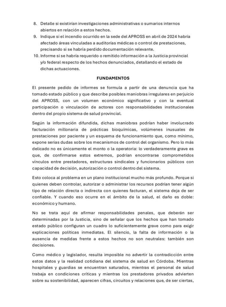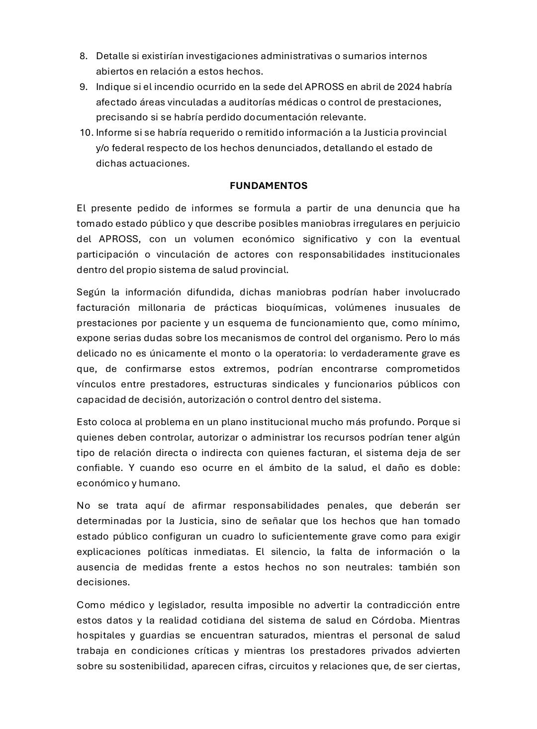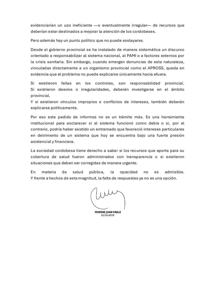 «¿Cómo puede ser que el sistema esté al borde del colapso y al mismo tiempo se hable de cifras millonarias que nadie explica?», cuestionó Peirone. El legislador también fue tajante al señalar que, en este caso, la responsabilidad es exclusivamente del Gobierno Provincial, desestimando los intentos de responsabilizar a factores externos o niveles nacionales de gobierno, dado que el APROSS es una entidad de dependencia directa de Córdoba.