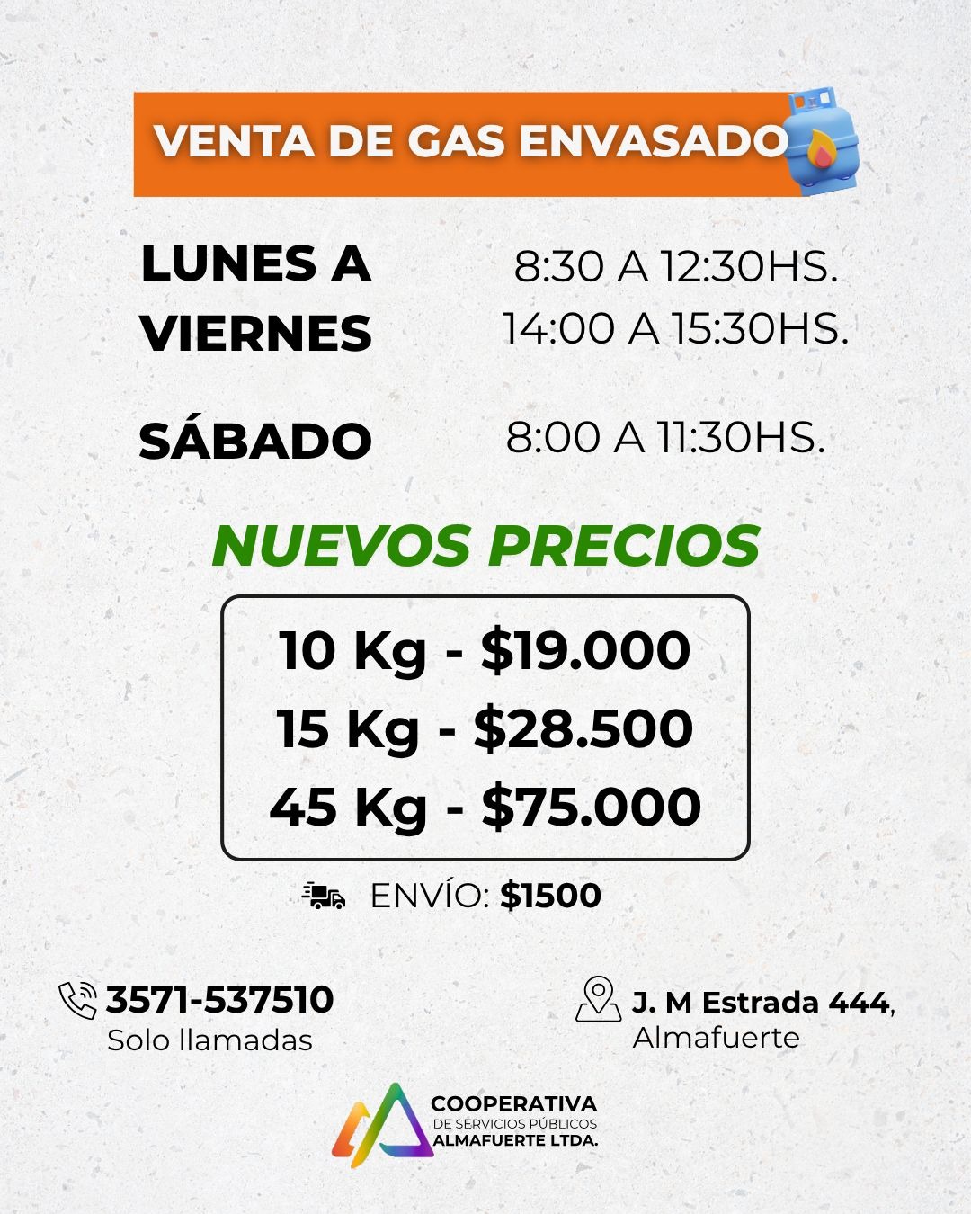 La Cooperativa local difundió el nuevo esquema de costos para garrafas y tubos de 45 kg. Además de la venta presencial en su sede de calle Estrada, se mantiene vigente el servicio de reparto a domicilio para mayor comodidad de los asociados y vecinos.