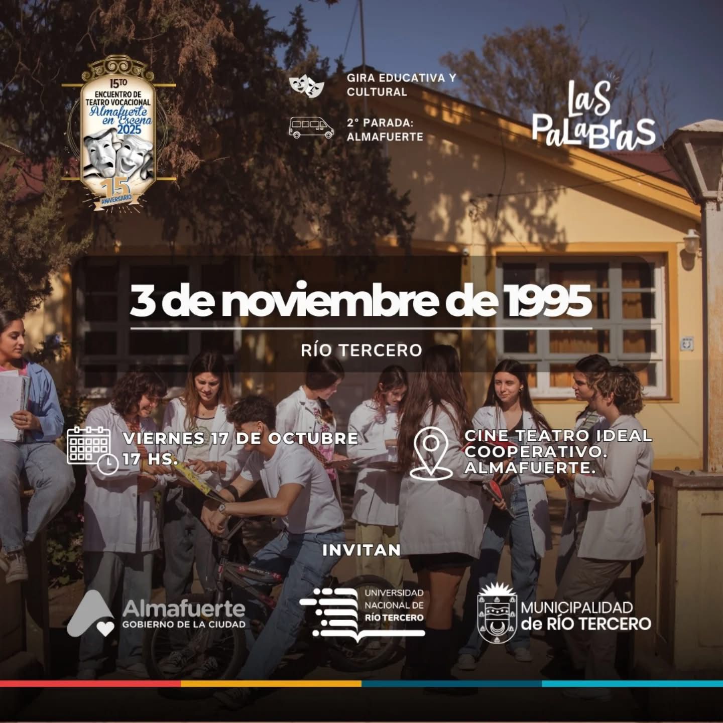El elenco de teatro adolescente LaS PaLaBraS presentará su obra “3 de noviembre de 1995” el próximo viernes 17 de octubre a las 17 horas, en el Cine Teatro Ideal Cooperativo de Almafuerte, en el marco del encuentro teatral “Almafuerte en escena”, con el acompañamiento de la Municipalidad de Almafuerte.