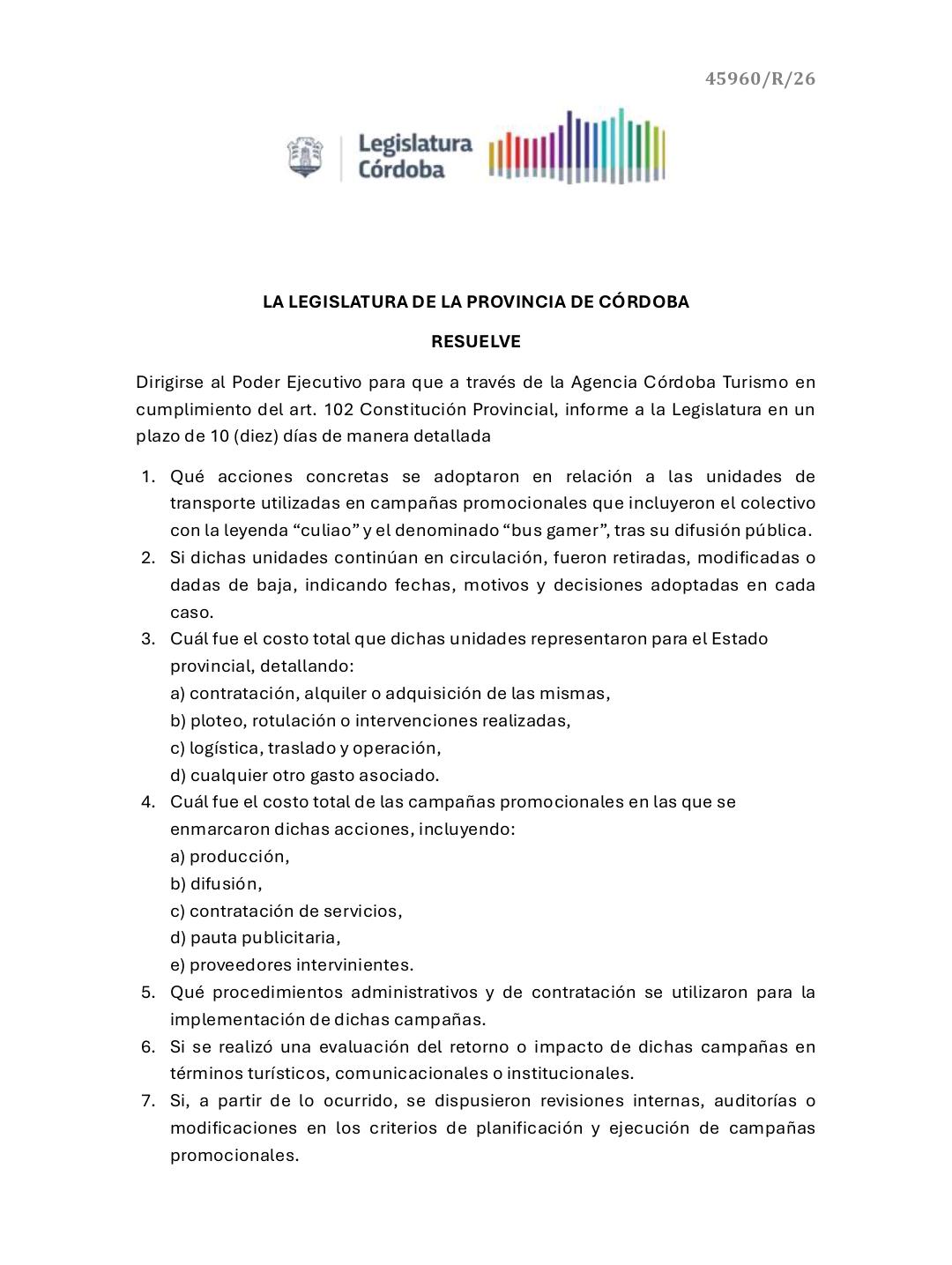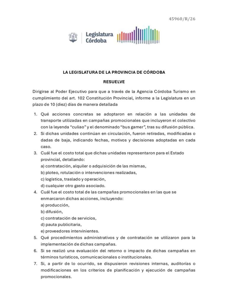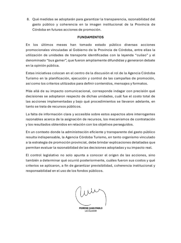 El legislador provincial Juan Pablo Peirone presentó un pedido de informes para que el Gobierno de Córdoba detalle el uso de recursos destinados a campañas promocionales impulsadas por la Agencia Córdoba Turismo.