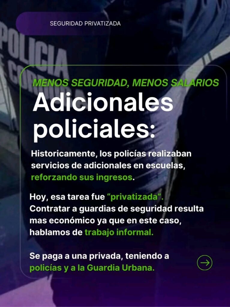 Peirone también señaló que anteriormente esas tareas eran realizadas por efectivos policiales mediante el sistema de adicionales, y consideró que la nueva modalidad afectaría esa posibilidad de ingreso para los uniformados.