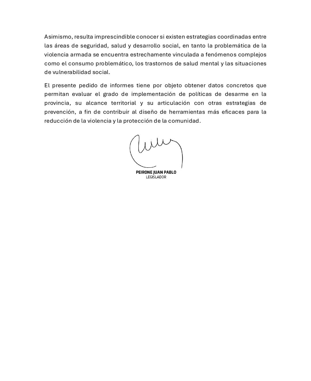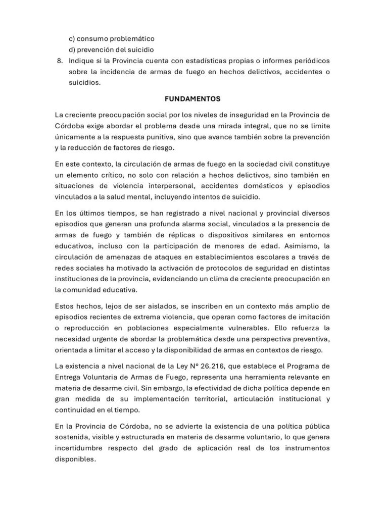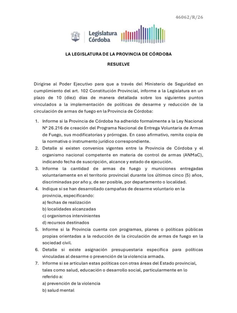 El pedido de informes presentado por el parlamentario apunta a conocer la efectividad de las herramientas actuales de la Provincia. Entre los puntos principales, Peirone interpela sobre el estado del programa de entrega voluntaria de armas y si existe una política sostenida de desarme civil en el territorio cordobés.