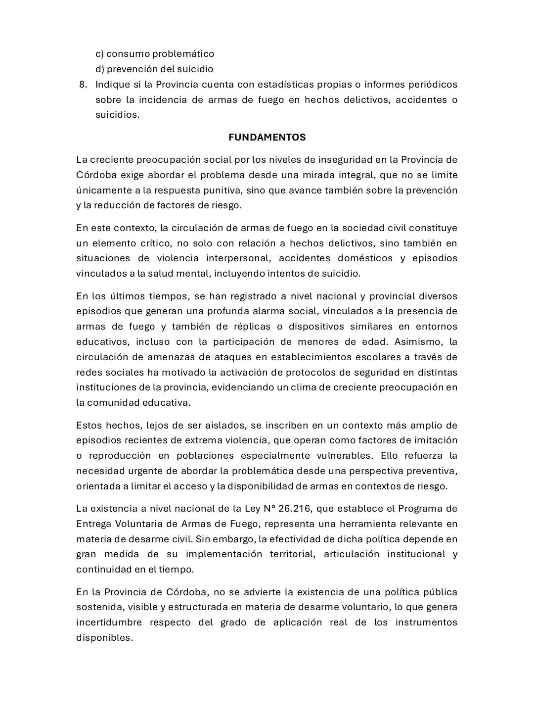 «La violencia no empieza cuando se dispara un arma, empieza mucho antes: en el acceso y en la falta de control», sostuvo el legislador. Asimismo, subrayó que este no es solo un tema policial, sino que está íntimamente ligado a la salud mental. En su presentación, cuestiona si existe una articulación real entre las carteras de Seguridad, Salud y Desarrollo Social para abordar de manera integral la crisis de bienestar psicológico que afecta a los jóvenes y que, en muchos casos, deriva en conductas violentas.