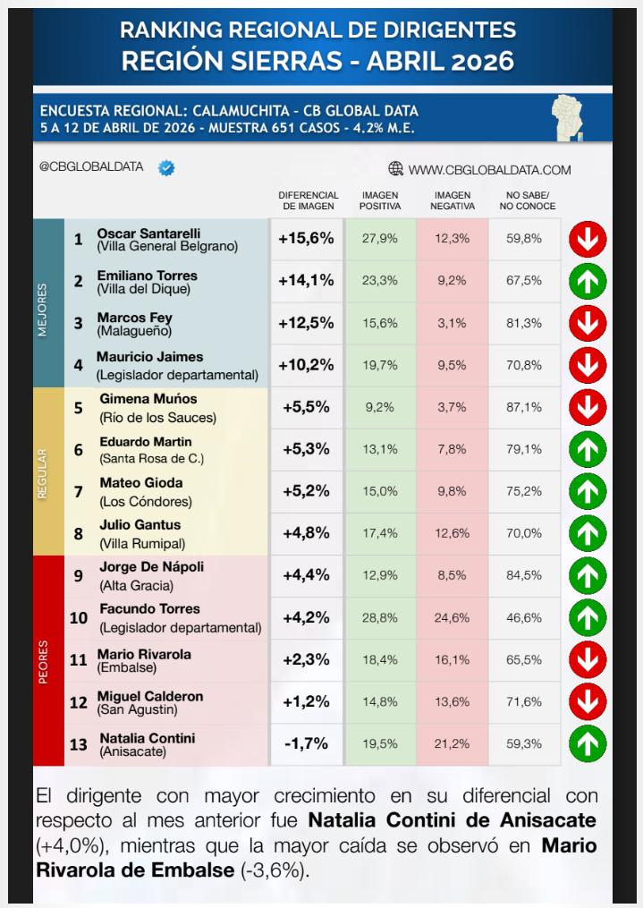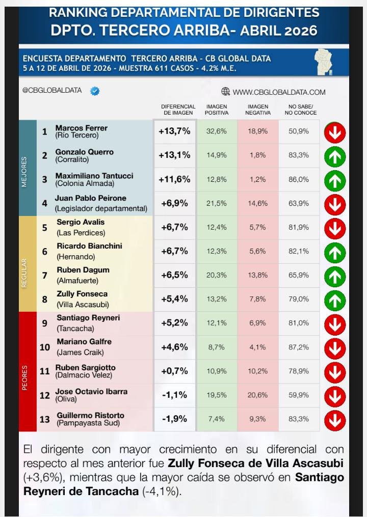 Los datos de abril de la consultora CB Global Data exponen el mapa político regional. En Tercero Arriba, el intendente de Río Tercero y el legislador Juan Pablo Peirone superan en diferencial de imagen a Rubén Dagum, quien no logra romper la barrera de la zona media. En Calamuchita, Oscar Santarelli y Emiliano Torres se consolidan como los referentes con mayor aprobación.