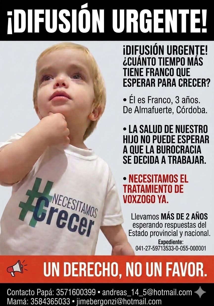 Desde Tiempo Regional, nos sumamos al pedido de visibilización de este caso que toca de cerca a nuestros vecinos. Para quienes deseen colaborar con la difusión o contactar a la familia, se han puesto a disposición los números de su papá (3571-600399) y su mamá (3584-365033). Es imperativo que el Estado asuma su responsabilidad para que Franco pueda acceder al tratamiento que le permita crecer con las mismas oportunidades que cualquier otro niño en *nuestra querida Córdoba.