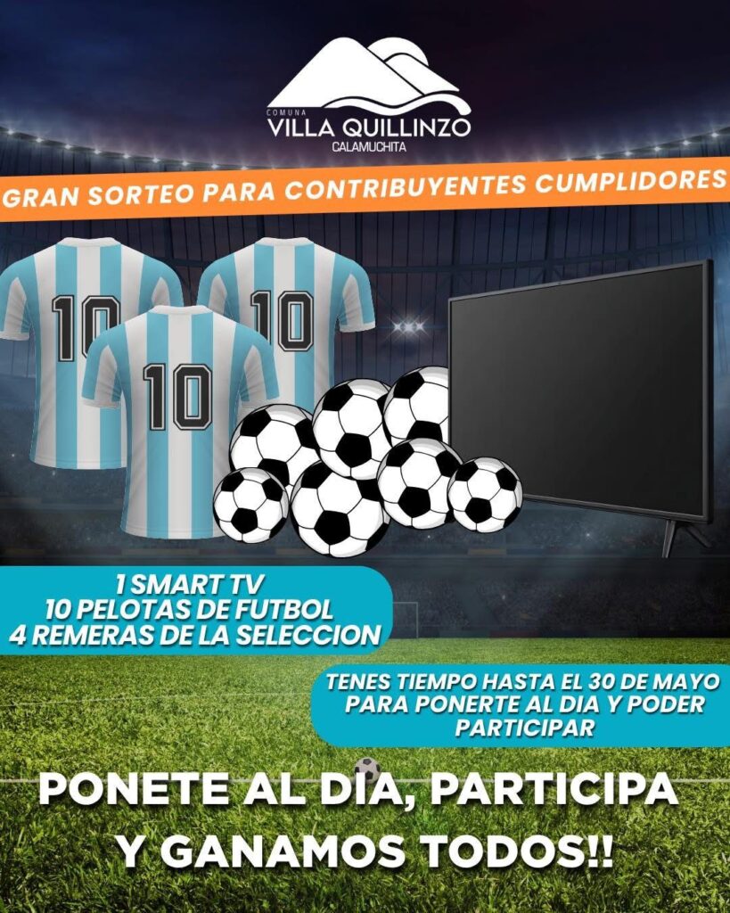 En total, se sortearán 10 pelotas de fútbol y 4 remeras oficiales de la Selección Argentina, una propuesta que busca llegar a diferentes integrantes de las familias de Villa Quillinzo. Los premios no solo incentivan el pago, sino que también promueven el sentido de pertenencia y comunidad en esta localidad del departamento Calamuchita, estrechamente vinculada al movimiento regional de nuestro departamento.